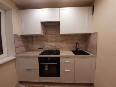 Соберём каркасы, навесим шкафы, дверцы и фурнитуру. Всё отрегулируем. Установим, мойку с сифоном и смесителем.